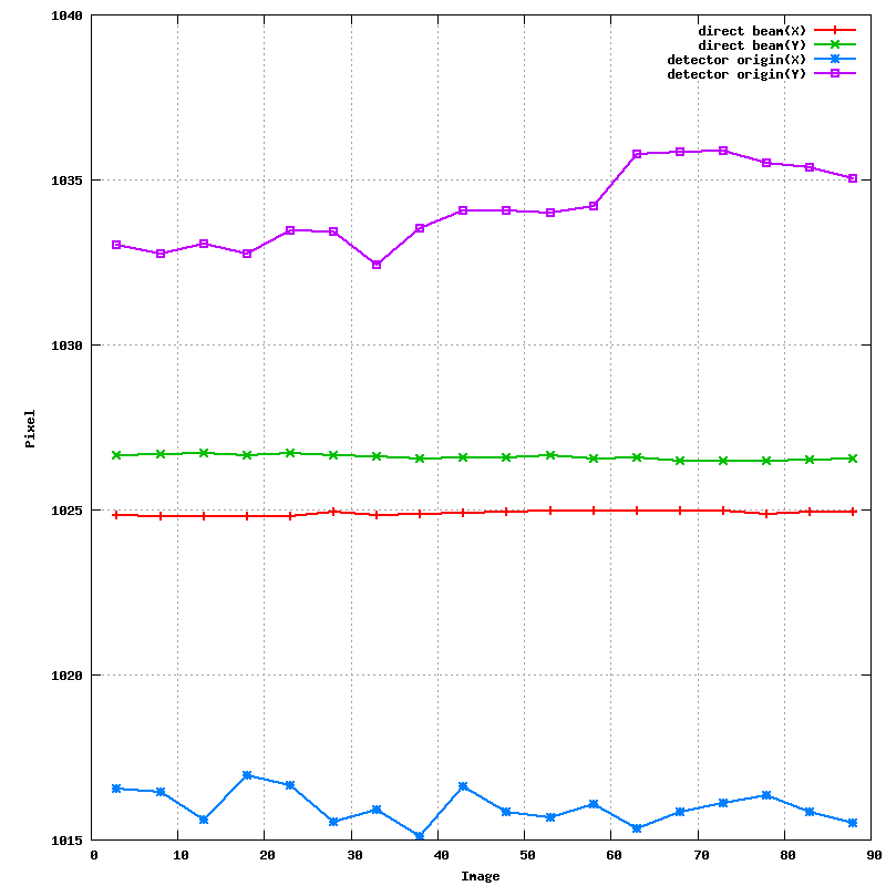 • the beam centre is recorded as exactly the mid-point of the image: this is slightly unusual, unless the detector is extremely well aligned on the beamline.