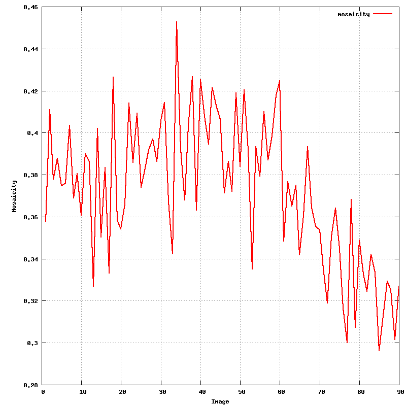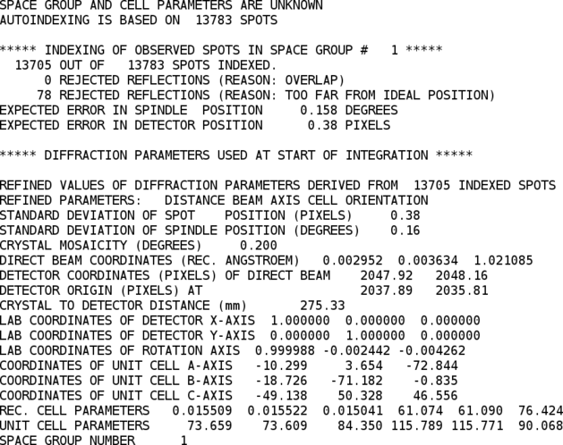 One can already see, that P1 might not be the finally correct spacegroup (two cell axes are nearly identical and the angles are very close to 90 degree). However, to do a final assignment of the most likely space group it is better to have a full set of integrated intensities available - so the following integration is till run in spacegroup P1.