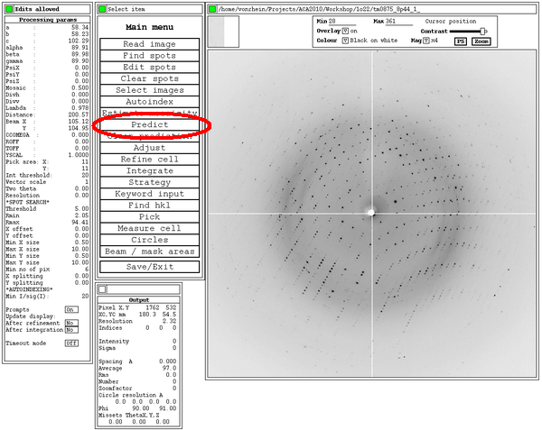 After hitting the 'Predict' button, the predictions given the current orientation matrix are shown: these should superimpose on actual spots . Ideally, all spots should have a prediction box around them: this depends on an accurate estimate of mosaicity though. After the initial indexing this value isn't yet available, but can be estimated from within MOSFLM: