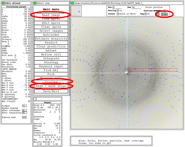 • drawing circles to show resolution limits (to check up to which resolution there are actually spots visible)