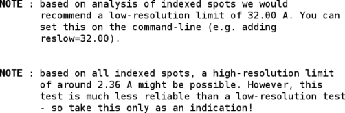 Using the list of indexed spots, some predictions of likely low- and high-resolution limits can be made as well.