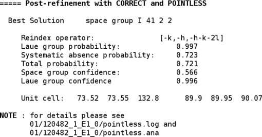 Since by default the initial integration was done in P1, POINTLESS is now used to determine the most likely space group: