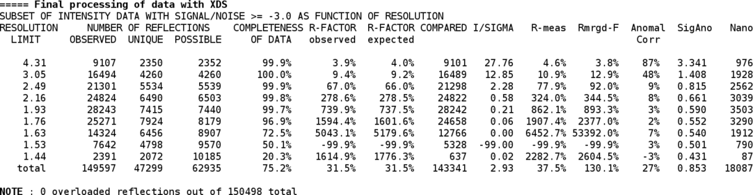 Now that the (hopefully) correct space group is know, the integration is repeated with these settings. At the end an updated table of statistics, a summary and an updated visualisation file are produced: