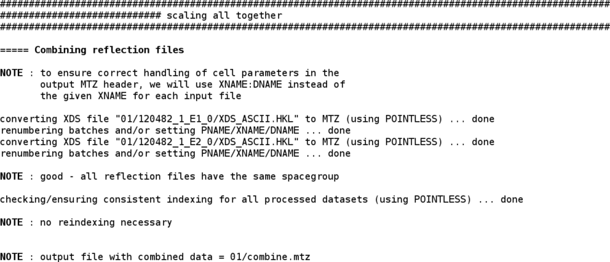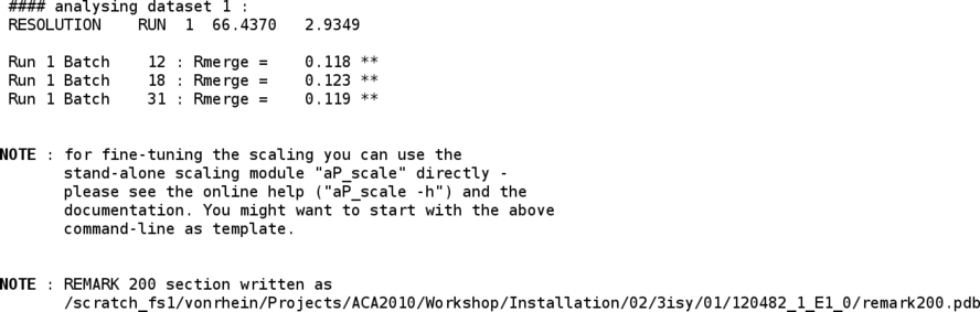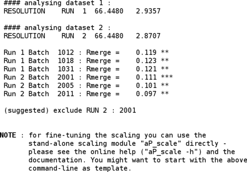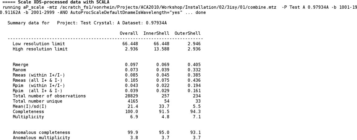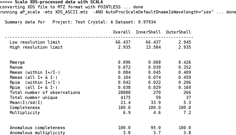 Now that a set of integrated intensities is available, they need to be scaled and merged with an appropriate high-resolution cut being applied. For that we use the SCALA program (through the "aP_scale" tool). The scaling step can also be run by hand using the "aP_scale" tool - for more help just run