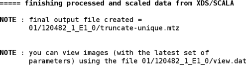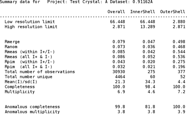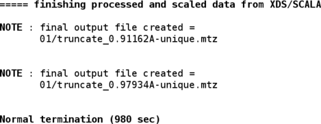 • a SCALEPACK-formatted, merged reflection file for each wavelength - to be used in autoSHARP: 01/scala_0.91162A.sca and 01/scala_0.97934A.sca